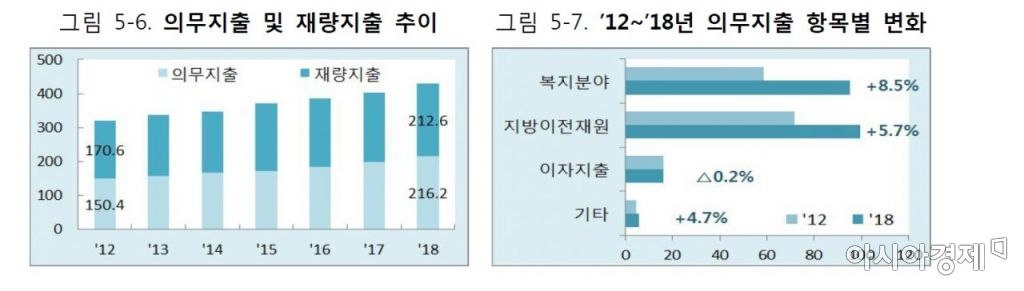 [아시아경제 김민영 기자] 올해 정부 예산 중 필요에 따라 줄이기 어려운 의무지출의 비중이 사상 처음으로 재량지출 비율을 넘어섰다. 정부가 양극화ㆍ저성장 등을 해결하기 위해 복지지출을 확장적으로 편성했기 때문이다. 앞으로 고령화ㆍ저출산 극복을 위해 복지 예산 증가 속도가 더 빨라지면 정부의 재정 운용에 부담이 커질 것이라는 지적이 나온다.2일 정부가 발간한 '2018년 재정정책보고서'를 보면 올해 의무지출은 217조원으로 총 지출의 50.6%를 넘어서며 처음으로 재량지출(211조9000억원) 비중(49.4%)을 추월했다. 의무지출이 재량지출을 넘어선 것은 올해가 처음이다.정부가 운용하는 재정지출은 의무지출과 재량지출로 구성된다. 의무지출은 공적연금ㆍ건강보험ㆍ지방교부세ㆍ지방교육재정교부금 등 법률에 '지급 의무'가 명시된 예산을 말한다. 정부가 원한다고 마음대로 삭감할 수 없는 예산이다. 재량지출은 말 그대로 정책적 의지에 따라 재량껏 대상과 규모를 어느 정도 통제할 수 있는 예산이다.통제가 어려운 의무지출이 증가한 이유는 복지분야 지출이 급격히 늘어났기 때문이다. 2012년부터 올해까지 의무지출 증가를 항목별로 보면 복지 분야가 연평균 8.5%, 지방이전재원이 5.7%, 기타 의무지출이 4.7% 각각 증가했다. 이자지출만 금리하락 영향으로 0.2% 감소했다.의무지출 규모와 비중은 향후 지속적으로 늘어날 전망이다. 문재인 정부 출범 이후 아동수당 신설, 기초연금 인상 등 복지제도를 확대하면서 복지지출이 점점 더 늘어나는 구조는 더욱 강화됐다. 당장 내년 정부예산안의 의무지출은 242조원(51.4%)으로 올해보다 더 많아졌다.문제는 앞으로다. 노인 인구 증가, 저출산 심화, 공무원 증가 등으로 수급자 수가 늘어날 수밖에 없어 복지지출 증가 속도가 가팔라지고 있어서다. 이에 따라 2018~2022년 전체 의무지출은 연 7.8%씩 증가해 총 지출 대비 비중이 올해 50.6%에서 2022년엔 51.6%로 1.0%포인트 늘어날 것으로 예상된다. 특히 복지분야 의무지출은 연평균 10.3% 늘어나 2022년엔 141조6000억원에 달할 전망이다. 한 번 늘리면 되돌리기 어려운 성격의 복지지출이 증가하면 정부의 재정건전성에도 빨간불이 들어온다. 저성장에 따른 생산인구 감소로 국가 지출은 늘어나는 반면 경제성장률 둔화에 따른 수입 감소로 인해 재정건전성이 악화할 수 있다는 관측도 있다. 국회 예산정책처는 지난 8월 '2016~2060년 장기 재정전망' 보고서를 통해 국내총생산(GDP) 대비 총 수입은 지속적으로 감소하는 반면 총 지출이 급격히 증가해 GDP 대비 국가채무 비율은 2016년 39.5%에서 2060년 151.8%로 무려 112.3%포인트 급상승할 것이라고 전망했다.국제신용평가사 피치도 재정건전성을 유지하기 위한 관리가 중요하다고 지적했다. 스티븐 슈바르츠 피치 국가신용등급 아태지역 총괄 등 피치 평가단은 최근 김동연 경제부총리 겸 기획재정부 장관과 면담하고 "최근 한국경제가 여전히 양호한 성장세를 유지하고 있다"고 평가하면서도 "앞으로도 재정건전성을 유지하기 위한 관리가 중요하다"고 전했다.세종=김민영 기자 argus@asiae.co.kr<ⓒ세계를 보는 창 경제를 보는 눈, 아시아경제(www.asiae.co.kr) 무단전재 배포금지>