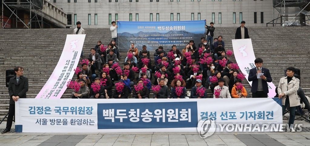 7일 오전 서울 종로구 세종문화회관 계단에서 국민주권연대와 한국대학생연합 주최로 '김정은 북한 국무위원장 서울 방문 환영 백두칭송위원회 결성 선포 기자회견'이 열렸다. / 사진=연합뉴스