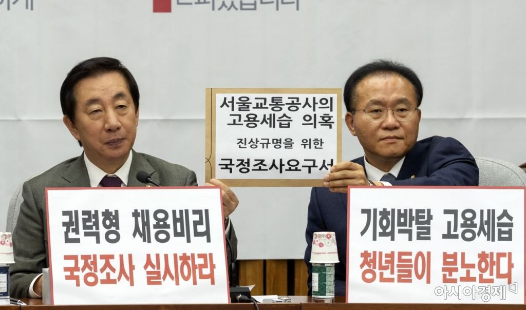김성태 자유한국당 원내대표가 19일 국회에서 열린 국감대책회의 도중 '서울교통공사 채용비리 의혹과 관련해 국정조사를 요구'하며 국정조사 요구서 보여주고 있다./윤동주 기자 doso7@