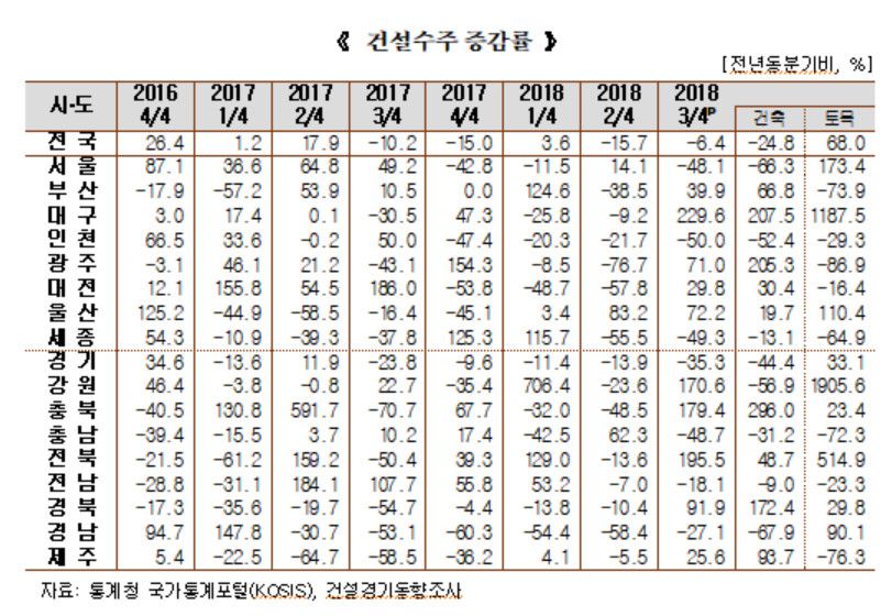 [아시아경제 이지은 기자] 주택시장 침체로 지난 3분기 전국의 건축수주가 전년 동기대비 24.8%나 감소한 가운데, 대구와 광주, 충북은 주택 수주가 늘며 전년 동기 대비 200% 이상 건축수주가 성장한 것으로 나타났다. 통계청이 15일 발표한 '3분기 지역경제동향'에 따르면, 3분기 전국 건축수주는 주택 수주 감소로 인해 24.8% 감소했다. 특히 서울의 경우 건축수주가 66.3%나 감소했으며, 경남(-67.9%), 강원(-56.9%)도 주택 수주 부진으로 50% 이상의 감소세를 보였다. 반면 충북과 대구는 주택과 공장·창고 수주가 늘며 각각 전년 동기대비 296.0%, 207.5% 증가했다. 광주 역시 205.3% 증가했다. 부산은 66.8%, 대전과 울산은 30.4%, 19.7% 증가했다. 전북도 48.7% 증가했으며 경북이 172.4%, 제주가 93.7% 증가했다. 건축수주가 감소한 것과 달리 토목수주는 발전·송전, 철도·궤도의 호조로 전년 동기대비 68% 증가했다. 특히 강원은 발전·송전 호조로 전년 동기대비 1905.6%나 토목수주가 증가했으며, 대구도 기계설치 수요로 인해 1187.5% 증가했다. 전북도 도로·교량 호조로 514.9% 증가했다.이지은 기자 leezn@asiae.co.kr<ⓒ세계를 보는 창 경제를 보는 눈, 아시아경제(www.asiae.co.kr) 무단전재 배포금지>