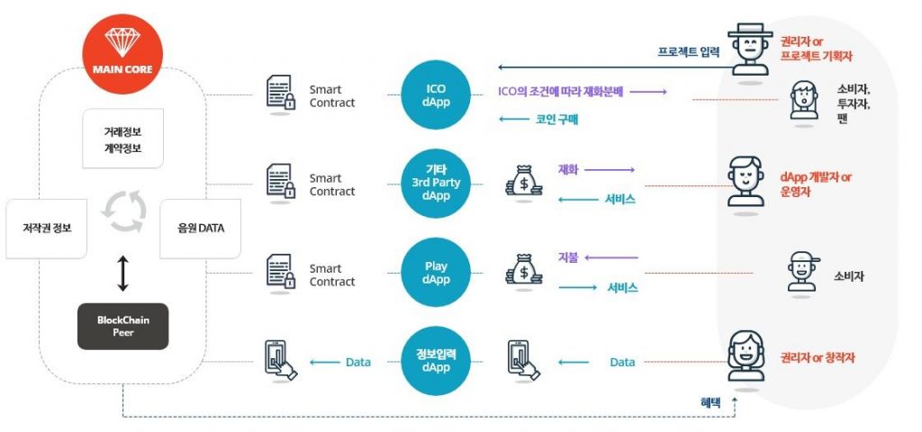 재미컴퍼니가 개발중인 블록체인 음원유통 플랫폼의 기본 시스템 구성도[사진:재미컴퍼니 홈페이지]