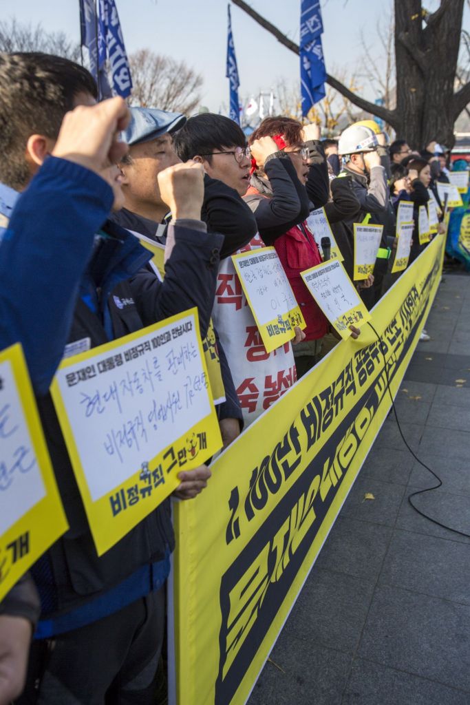 12일 서울 종로구 정부서울청사 앞에서 열린 '비정규직 노동자 공동투쟁 기자회견'에 참가한 민주노총 소속 조합원을 비롯한 비정규직 노동자들이 문재인 대통령에게 면담을 요청하고 있다./강진형 기자aymsdream@