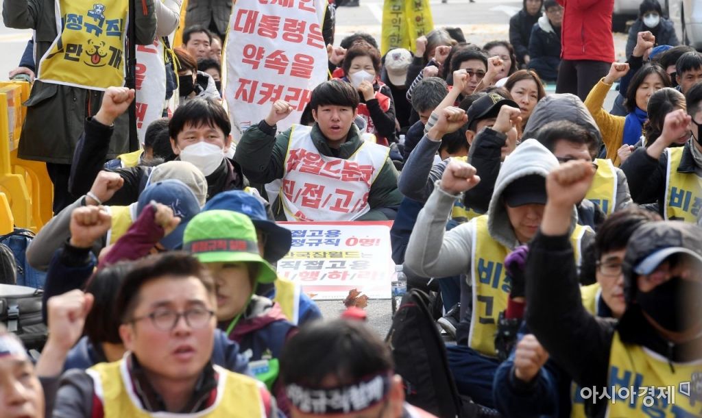 16일 서울 종로구 청와대 사랑채 앞에서 열린 비정규직 철폐 공동행동 결의대회에서 비정규직 노동자들과 민주노총 관계자들이 공동투쟁을 외치며 정규직 전환을 촉구하고 있다./김현민 기자 kimhyun81@