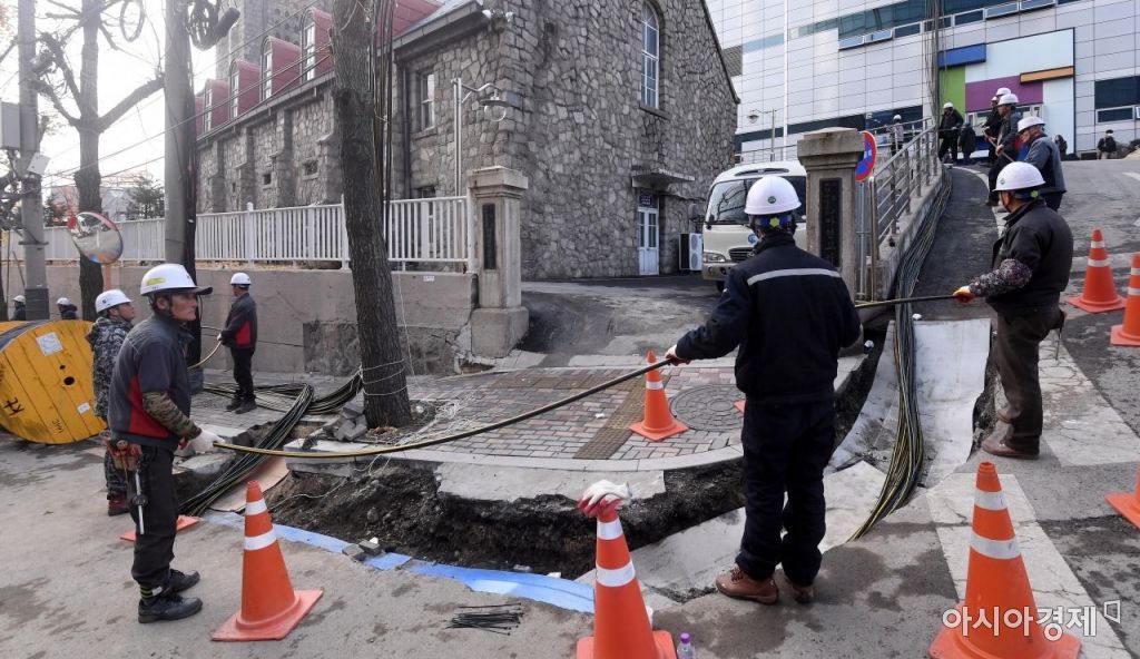 경찰과 소방 관계자들이 25일 서울 서대문구 충정로 KT아현국사 앞 공동구 화재현장에서 전날 발생한 화재 원인을 조사하기 현장 감식을 하고 있다./김현민 기자 kimhyun81@