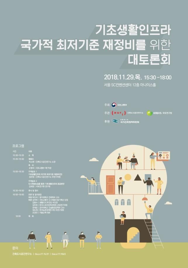 [아시아경제 주상돈 기자] 국토교통부는 국가건축위원회, 건축도시공간연구소, 국토연구원과 함께 29일 오후 서울 SC 컨벤션에서 '기초생활인프라 국가적 최저기준' 재정비를 위한 대토론회를 개최한다.기초생활인프라 국가적 최저기준은 10년 단위의 도시재생전략인 국가도시재생 기본방침(2014~2023)에 포함된 내용이다. 올 2월 발표한 도시재생 뉴딜 로드맵에 따라 주민중심, 수요자중심, 생활밀착형의 기준으로 재정비를 준비하고 있다.국토부는 기초생활인프라 국가적 최저기준을 범정부적 기준으로 활용하기 위해 국무조정실과 문화체육관광부, 보건복지부, 교육부 등 관련 부처와 공조하고 있다. 향후 관련 부처가 생활SOC 공급계획의 근거로 활용할 수 있도록 할 계획이다.국토부 관계자는 "이번 토론회는 기초생활인프라 국가적 최저기준이 지역밀착형·주민체감형 국가기준이 되기 위한 중요한 과정"이라며 "현재 국토부, 건축도시공간연구소 및 국토연이 준비하고 있는 국가적 최저기준(안) 및 생활SOC의 공급전략을 국민들에게 설명하고, 다양한 의견을 수렴할 계획"이라고 설명했다.우선 첫 번째 발제주제인 '기초생활인프라의 국가적 최저기준 재정비(안)'에서는 소득 3만달러 시대에 적합한 수요자중심형·주민체감형 국가적 최저기준의 방향성을 제시한다. 이어 '도시재생 뉴딜사업을 통한 생활SOC 공급방안'에서는 정부의 역점사업으로 추진하고 있는 도시재생 뉴딜사업을 통한 생활SOC 복합시설 공급을 제안한다.국토부는 이번 토론회에서 제시된 의견을 바탕으로 국민의 눈높이에 맞는 기초생활인프라 국가적 최저기준을 올 12월 수립해 국가도시재생 기본방침에 반영할 예정이다. 또 도시재생 뉴딜사업을 통해 최저기준에 부합하는 생활SOC 복합시설을 적극 공급할 계획이다.이번 토론회에 참석을 원하는 국민과 지방자치단체, 전문가는 건축도시공간연구소 홈페이지 또는 사회연결망서비스에서 신청할 수 있다.주상돈 기자 don@asiae.co.kr<ⓒ경제를 보는 눈, 세계를 보는 창 아시아경제(www.asiae.co.kr) 무단전재 배포금지>