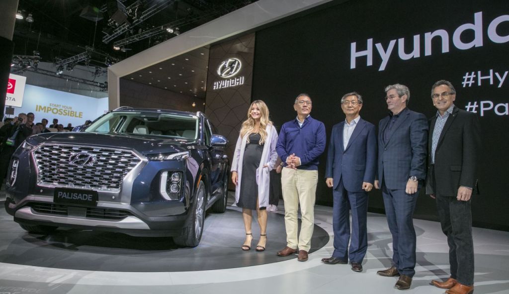 (왼쪽부터) LA오토쇼 펠리세이드 발표에 참가한 인플루언서 메디슨 피셔(Madison Fisher), 현대자동차그룹 정의선 수석총괄부회장, 연구개발총괄 양웅철 부회장, 현대자동차그룹 디자인 담당 루크 동커볼케 (Luc Donkerwolke)부사장, 미국법인(HMA) 최고운영책임자(COO) 브라이언 스미스(Brian Smith)/사진=현대차