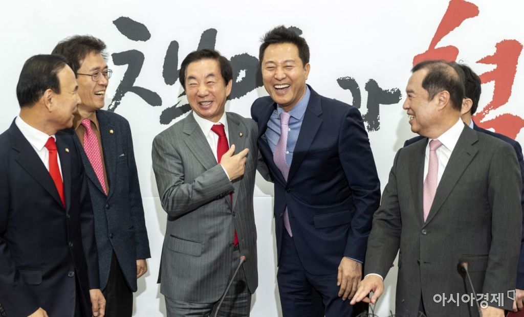 오세훈 전 서울시장이 29일 국회에서 열린 자유한국당 입당식에서 김병준 비대위원장, 김성태 원내대표와 인사를 나누고 있다./윤동주 기자 doso7@