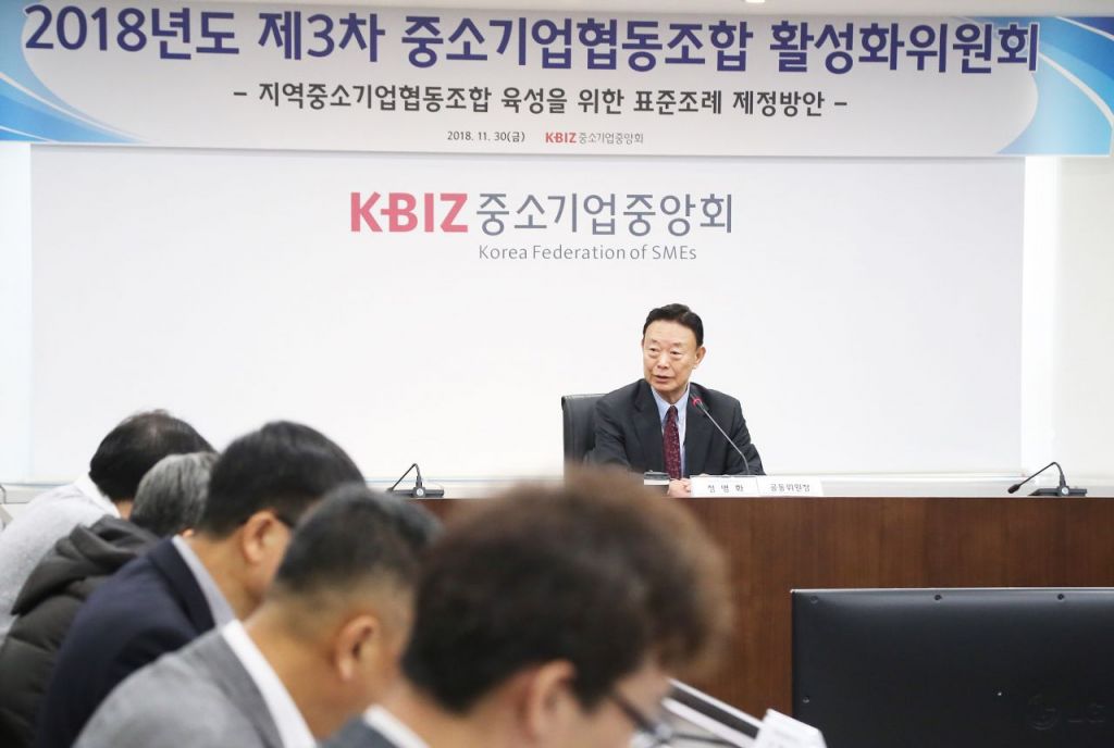 30일 서울 여의도 중기중앙회에서 열린 협동조합활성화위원회에서 정명화 공동위원장이 위원들에게 '표준조례안 제정방안' 등에 대해 이야기를 하고 있다.