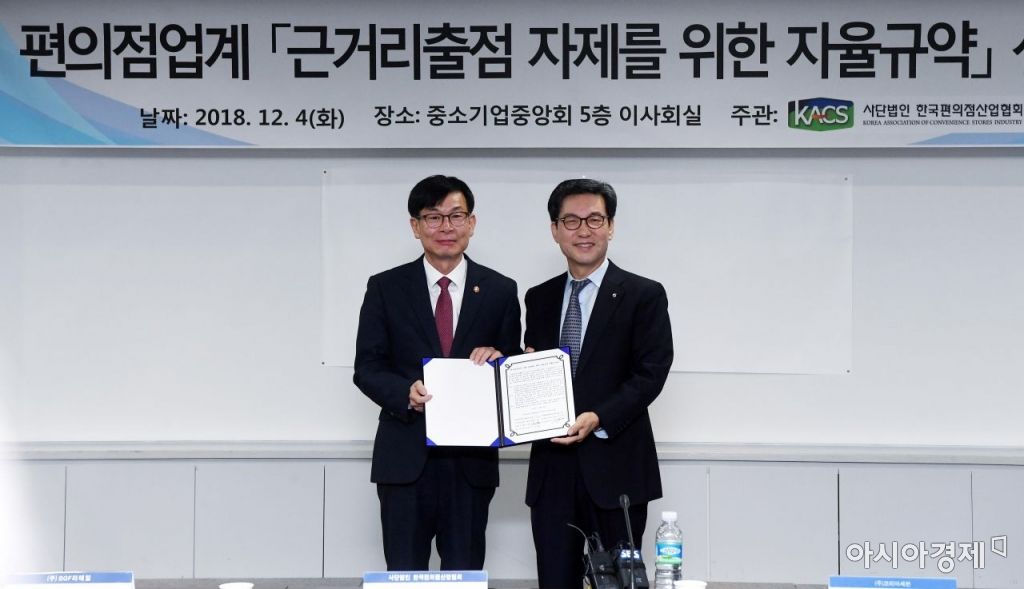 [아시아경제 지연진 기자] 신규 편의점 출점을 막기 위한 ‘거리 제한’ 규정이 18년 만에 부활하면서 논란이다. 무분별한 출점을 막아 편의점주들의 경영 부담을 덜어주겠다는 취지지만, 잇따른 최저임금 인상의 역풍을 막기 위해 정부와 여당이 나서 불공정 거래를 조장한다는 비판이 나온다.공정거래위원회와 한국편의점산업협회는 4일 서울 여의도 중소기업중앙회에서 편의점 업계의 근접 출점 자제 방안이 담긴 자율규약 협약식을 개최했다. 이는 공정위가 지난달 30일 편의점협회가 마련한 자율규약안을 승인한데 따른 것으로, 편의점 신규 출점 거리 제한을 다른 브랜드에도 적용한 것이 핵심이다. 현재 같은 브랜드는 250m 거리 안에서 출점을 못하도록 하고 있지만, 다른 브랜드간 근접 출점을 막는 규정은 없다.자율규약은 협회 소속인 CU와 GS25, 세븐일레븐, 미니스톱, 씨스페이스 등 5개 편의점 가맹본부는 물론, 신세계 계열의 이마트24가 참여했다. 이들 6개 편의점 가맹본부는 신규 출점시 개점 예정지 상권 입지의 특성과 유동인구수, 담배 소매인 지정거리 등을 종합적으로 판단해 출점 여부를 결정해야 한다. 현재 담배 판매는 도시의 경우 50m, 농촌은 100m 거리 제한 규정이 적용된다. 다만 담배 판매권 거리 제한은 각 자치구의 규칙 개정이 필요한 사항으로, 서울시가 최근 50m를 100m로 늘리는 방안을 추진 중인 만큼 편의점도 ‘100m 거리 제한’을 따르게 될 전망이다. 사실상 ‘100m 거리 제한’ 규제가 만들어진 것이다.앞서 편의점 업계는 1994년 ‘80m 거리 제한’에서 출점을 못하도록 한 자율규약을 제정해 시행했으나 2000년 공정위로부터 ‘부당한 공동행위금지 위반’으로 시정명령을 받고 중단했다. 하지만 최저임금이 올해부터 2년 연속 큰 폭으로 오르면서 인건비 부담이 커진 편의점주들이 , 사실상 ‘거리 제한’ 규제가 부활한 것이다. 당초 공정위는 편의점 업계가 지난 7월 ‘80m 거리 제한’ 규정이 담긴 자율규약안을 마련해 심사를 요청했지만, 이같은 자율규약이 ‘담합’이라는 이유로 심사를 . 하지만 문재인 대통령이 지난 달 27일 편의점 과밀해소 대책을 지시하자, 공정위가 일주일여만에 입장을 바꿨다. 김상조 공정위원장은 “급격한 성장 이면에 과도한 출점경쟁으로 같은 건물 내에 여러 개의 편의점이 출점하기도 했다”면서 “업계가 오늘 발표한 규약 내용에 과밀화를 해소하기 위한 방안들이 잘 포함돼 있다”고 평가했다.일각에선 이같은 거리 제한 자율규정이 시행되면 창업 문턱이 높아져 기존 편의점들이 시장을 독식할 수 있다는 지적이 제기된다. 후발 편의점 사업자들이 확장이 불가능하기 때문이다. 공정한 시장 경쟁을 조성하는 업무를 맡은 공정위가 되려 불공정 거래를 조장한다는 비판이 나오는 이유다. 편의점 업계 관계자는 “앞으로 편의점 창업을 희망할 경우 웃돈을 얹어주고 인수해야 하는 만큼 기존 점주들만 로또(복권)에 당첨된 상황”이라며 “24시 운영되는 편의점 한 개가 생길 때마다 적어도 2~3개의 일자리가 만들어지는데 신규 출점이 어려워지면 일자리 창출이라는 문재인 정부의 핵심 국정 과제와도 맞지 않는다”고 꼬집었다.지연진 기자 gyj@asiae.co.kr<ⓒ경제를 보는 눈, 세계를 보는 창 아시아경제(www.asiae.co.kr) 무단전재 배포금지>