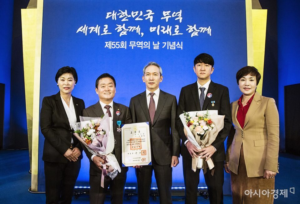 7일 서울 코엑스에서 열린 ‘제55회 무역의 날 기념식’에서 산업포장을 수상한 이병익 상무(왼쪽 두 번째)와 국무총리표창을 받은 홍 민 사원이(오른쪽 두 번째)이 이환성 회장(가운데)과 기념 촬영을 하고 있다.