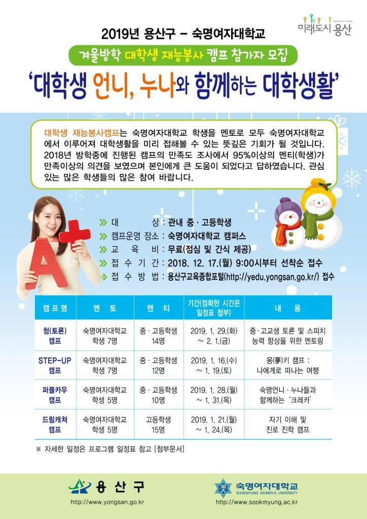 [아시아경제 박종일 기자] “대학생활 미리 한번 해볼까”용산구(구청장 성장현)가 숙명여대(총장 강정애)와 손잡고 ‘2019년도 겨울방학 대학생 재능봉사 캠프’를 운영한다.청소년들의 꿈과 역량을 키우고 가계 사교육비도 아끼는 이색 프로젝트다.숙대생 멘토단 24명이 2019년 1월16일부터 2월1일까지 숙대 캠퍼스에 ▲청(聽) ▲스텝업(STEP-UP) ▲퍼플카우 ▲드림캐쳐 등 4개 캠프를 차린다. 기간은 캠프별 4일씩이다.청(聽) 캠프(1월29~2월1일)는 숙대 토론리더십그룹 청(聽) 회원들이 맡는다. 중고교생 발표(스피치) 능력 향상과 대입 면접시험준비를 위한 멘토링이 이어진다.