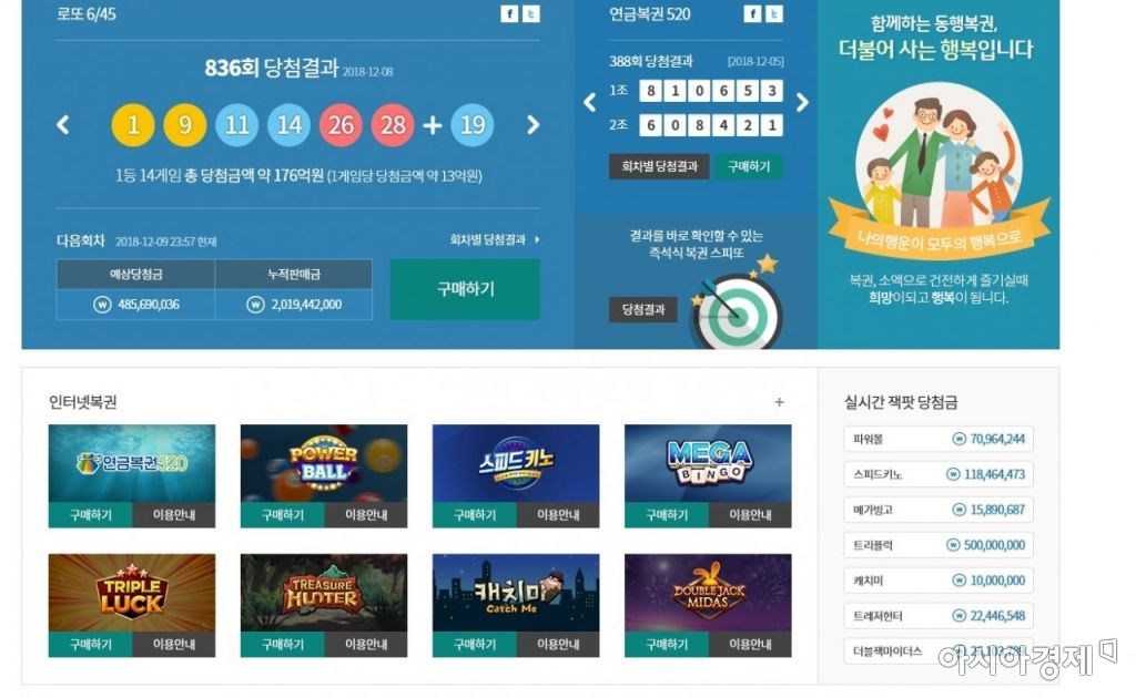 동행복권 인터넷 사이트에 있는 인터넷 복권들. 수천만~수억원대의 '잭팟 당첨금'도 안내하고 있다./사진=동행복권 홈페이지 캡처