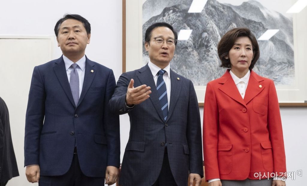홍영표 더불어민주당 원내대표와 나경원 자유한국당 원내대표, 김관영 바른미래당 원내대표 등 교섭단체 원내대표들이 17일 국회에서 회동을 갖고 있다. 3당 원내대표는 12월 임시국회 일정을 합의하기 위해 만났다./윤동주 기자 doso7@