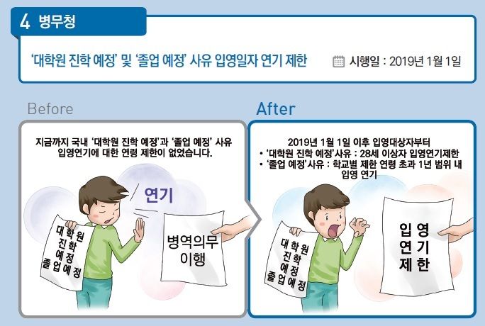 [세종=아시아경제 주상돈 기자] 내년부턴 '대학원 진학 예정' 및 '졸업 예정'을 사유로 한 입영일자 연기가 제한된다.26일 기획재정부는 이 같은 내용을 담은 '2019년부터 이렇게 달라집니다'를 발간했다.병무청에 따르면 지금까지 국내 대학원 진학 예정과 졸업 예정 사유 입영연기에 대한 연령 제한이 없었다. 이 탓에 병역의무 이행 지연 목적으로 편법 이용하는 사례가 발생하고 있었다.이에 재학생 입영연기 기간 초과(졸업제한 연령 초과)로 진학 예정 학교에 다닐 수 없는 대학원 진학 예정자와 장기 휴학 등으로 수년간 졸업을 유예하는 졸업 예정자에 대해 입영일자 연기를 제한하는 것이다. 2019년 1월1일 이후 입영대상자부터는 28세 이상의 경우 대학원 진학 예정 사유로는 연기가 제한되고, 졸업 예정 사유는 학교별 제한연령 초과 1년 범위 내에서만 연기가 가능해진다.이와 함께 내년부터는 병역의무부과 통지서를 스마트폰으로 받아볼 수 있도록 모바일통지서 발송이 시행된다. 모바일앱 통지서 수신을 신청한 병역의무자는 2019년부터 병무청 앱과 카카오알림톡으로 통지서를 받아 본인 인증 후 스마트폰에서 확인 할 수 있다.주상돈 기자 don@asiae.co.kr<ⓒ경제를 보는 눈, 세계를 보는 창 아시아경제(www.asiae.co.kr) 무단전재 배포금지>