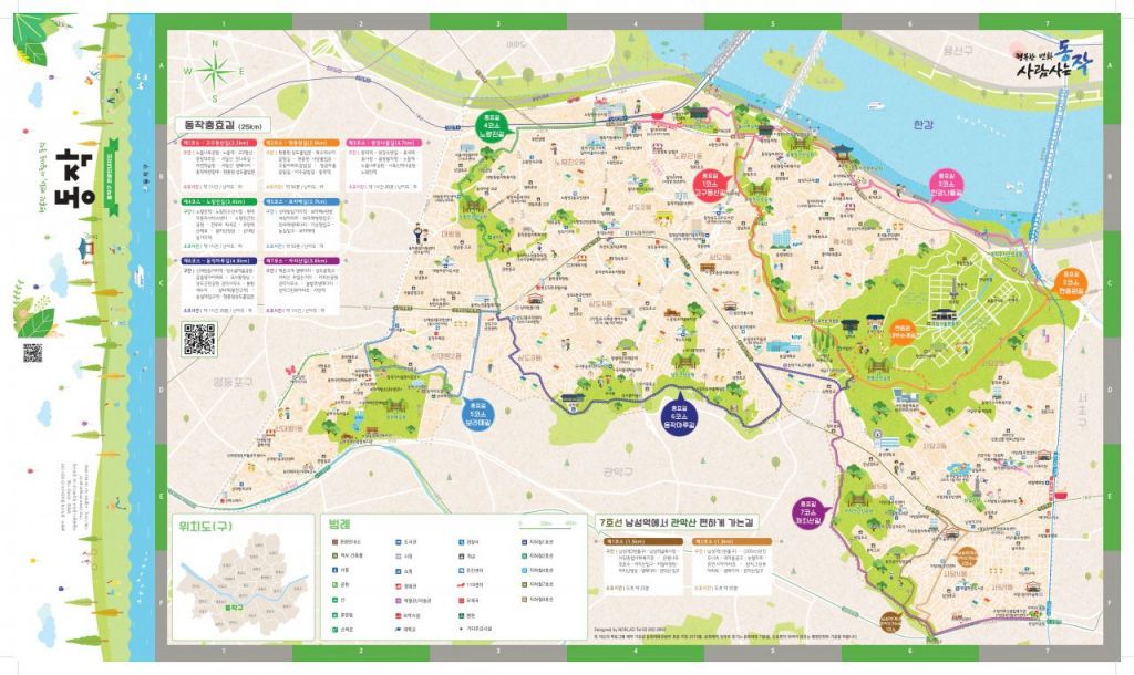 [아시아경제 박종일 기자] 동작구(구청장 이창우)가 지역 내 명소를 쉽게 찾고, 한 눈에 볼 수 있는 관광안내지도 2만부를 제작했다.이번 관광안내지도 제작은 구의 관광명소와 문화유산 등 다양한 최신정보를 수록한 홍보물을 통해 주민들에게 편의를 제공하고 대내외적으로 구를 홍보하기 위해 마련됐다.새롭게 선보이는 관광안내지도는 기존 일러스트레이션 기법에서 벗어나 거리 정확성과 주요정보의 시각적 표현을 살려 축척지도 방식으로 실제에 더 가깝게 디자인됐다.가로 72cm, 세로 42cm 크기 2단 8접 형태로 접어서 휴대하기 편리, 펼쳤을 때 지도가 한 눈에 들어오도록 제작했다.