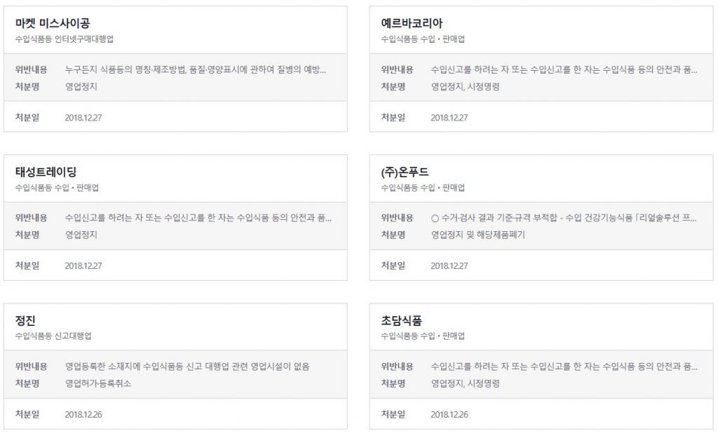 [아시아경제 최신혜 기자] 최근 소셜네트워크서비스(SNS), 블로그, 맘카페 등을 중심으로 건강기능식품 등 해외 수입식품을 홍보·구매하는 사례가 급증하는 가운데 수입식품 취급 업체 6곳이 엉터리 영업으로 무더기 행정처분을 받은 것으로 드러나 논란이 예상된다. 28일 관련 업계에 따르면 최근 식품의약품안전처는 수입식품 수입ㆍ판매ㆍ신고대행ㆍ구매대행 관련 업체 6곳을 관련 법률 위반 행위로 행정처분했다. 무려 5곳이 영업정지 처분을 받았고 1곳은 영업허가ㆍ등록이 아예 취소됐다. 행정처분 받은 수입식품등 수입ㆍ판매업체는 4곳이다. 경기도 광주 소재 '초담식품'은 '수입식품안전관리 특별법 제20조(수입신고 등) 2항ㆍ'수입식품안전관리 특별법 시행규칙 제46조'에 의거해 영업정지, 시정명령 처분을 받았다. 초담식품은 지난해 3월27일부터 4월3일까지 ‘보이차추출분말’ㆍ‘돌외잎추출분말’ 등을 수입신고하면서 제품의 해외제조업소명 및 소재지를 허위로 신고했다. 식약처에 따르면 초담식품에서 수입신고한 해외제조업소는 아예 식품을 제조가공하는 시설이 없는 것으로 확인됐다. 대전시 대덕구 소재 '온푸드'는 '건강기능식품에 관한 법률 제24조 1항' 위반으로 영업정지 및 해당 제품 폐기 처분을 받았다. 건강기능식품 '리얼솔루션 프로바이오틱스 생유산균(유통기한 2020년 10월26일)' 제품에 대해 식약처가 수거ㆍ검사한 결과 기능(지표) 성분 함량이 기준치를 채우지 못한 탓이다. 경기도 수원 소재 '태성트레이딩' 역시 지난해 1월16일부터 6월9일까지 ‘마리골드추출물분말’ㆍ‘비타민나무열매추출물분말’ 등을 수입신고하면서 해당 제품의 해외제조업소명 및 소재지를 사실과 다르게 수입신고해 영업정지 처분을 받았다. 경기도 성남 소재 예르바코리아도 2016년 12월5일부터 지난해 9월6일까지 ‘달맞이꽃종자오일’ㆍ‘비타민나무열매 분말’ 등을의 해외제조업소명 및 소재지를 사실과 다르게 수입신고해 영업정지, 시정명령을 받았다. 수입ㆍ판매업체뿐 아니라 신고대행업소도 엉터리 운영으로 행정처분을 받았다. 경기도 성남 소재 '정진'은 영업등록한 소재지에 아예 관련 시설이 없는 '유령회사'로 드러나 영업허가와 등록이 취소됐다. 네이버 스토어팜 등을 통해 영업해온 인터넷구매대행업체 '마켓 미스사이공'은 지난 9월 초부터 11월28일까지 베트남산 '동결건조 프리미엄 골드 노니과립 400g'을 구매대행 사이트에 게시하며 '노화방지 및 면역력 강화, 염증완화, 혈액순환에 도움' 등의 표현을 사용해 건강기능식품으로 오인·혼동할 수 있도록 광고해 '식품위생법 제13조(허위표시 등의 금지)1항'으로 영업정지 처분을 받았다. 건강을 위해 수입식품들을 자주 구매해온 소비자들은 분노를 감추지 못하고 있다. 주부 김윤아(32)씨는 "보이차추출분말이나 노니과립의 경우 TV건강프로그램 등을 통해 수차례 소개되며 맘카페 등에서 인기를 얻었던 수입식품"이라며 "어디서 제조된 것인지조차 모르는 제품들이 버젓이 유통되고 있다는 사실에 경악했고 실망 또한 크다"고 토로했다.최신혜 기자 ssin@asiae.co.kr<ⓒ경제를 보는 눈, 세계를 보는 창 아시아경제(www.asiae.co.kr) 무단전재 배포금지>