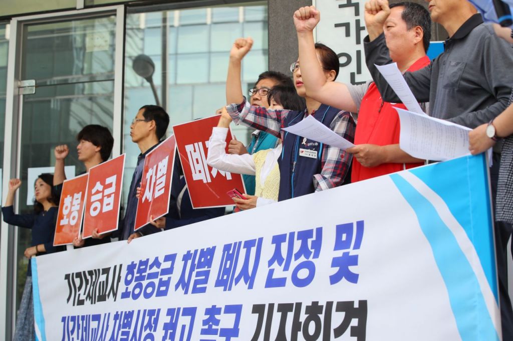 지난해 9월17일 전국기간제교사노동조합과 전국교직원노동조합원들이 서울 중구 국가인권위원회 앞에서 '기간제 교사의 호봉 승급 차별 폐지 진정 및 차별시정 권고 촉구' 기자회견을 하고 있다. [이미지출처=연합뉴스]