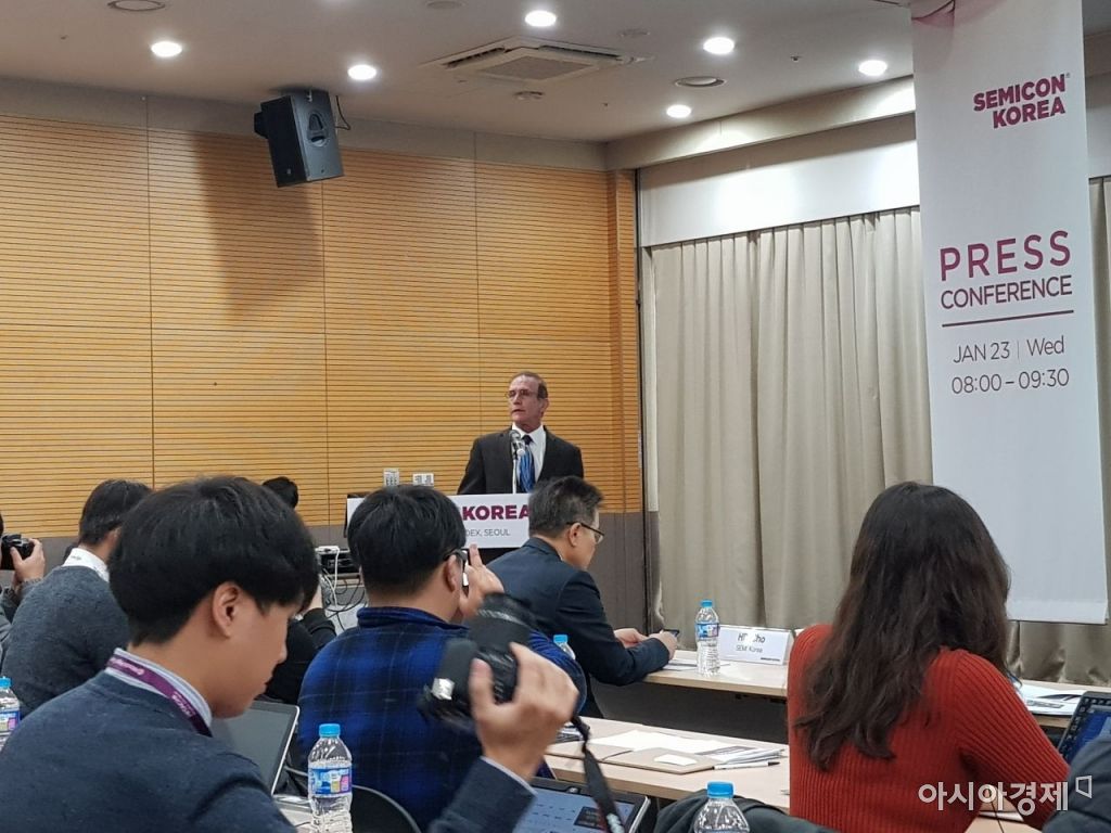 짐 펠드한 세미코 리서치 대표는 23일 서울 강남 코엑스에서 열린 '세미콘코리아2019'에서 2019년 반도체 시장전망을 발표하고 있다.