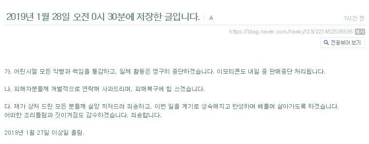 이후 그는 해당 글을 삭제하고 새로운 입장문을 게시했다.