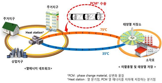 KIST 신유환 박사팀은 열 수송의 핵심 기술인 기존의 딱딱한 구슬모양의 열 저장 용기를 아주 작은 마이크로 사이즈의 유연한 타원형 PCM 캡슐 형태로 바꾸면서 성능을 대폭 개선했다. 기존 대비 열전달 성능을 5.5배 증가시켰고 열 저장 시 소요되는 시간을 50% 감소시키는 데 성공했다. 또한 독창적인 가시화 기법을 적용해 최초로 그 원리를 규명했다고 밝혔다. KIST 연구진은 이 기술을 이용해 마치 주유소와 같이, '열 스테이션'을 분기점별로 조성해 온수를 안정적으로 공급하는 아이디어를 제시했다.