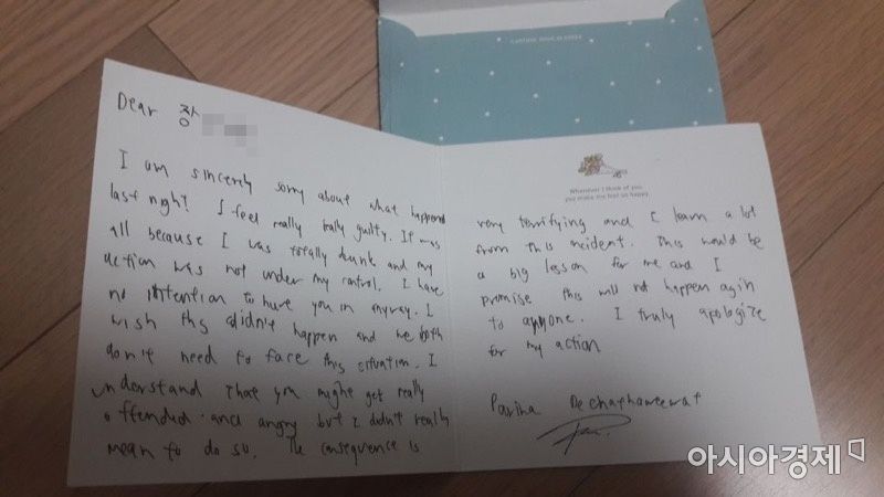 장씨가 공개한 편지에는 “지난 밤에 일어난 일에 대해 진심으로 죄송하다는 말씀을 드리고 싶다”며 “이번 일로 죄책감을 느끼고 있으며 앞으로 어떤 누구에게도 이 같은 행동을 하지 않겠다”는 내용이 담겼다.
