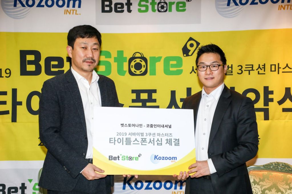 오성규 코줌인터내셔널 대표(왼쪽)가 조광석 벳스토어나인 대표와 서바이벌 3쿠션 마스터즈 타이틀스폰서십을 체결한 뒤 기념촬영하고 있다.[사진=코줌인터내셔널 제공]
