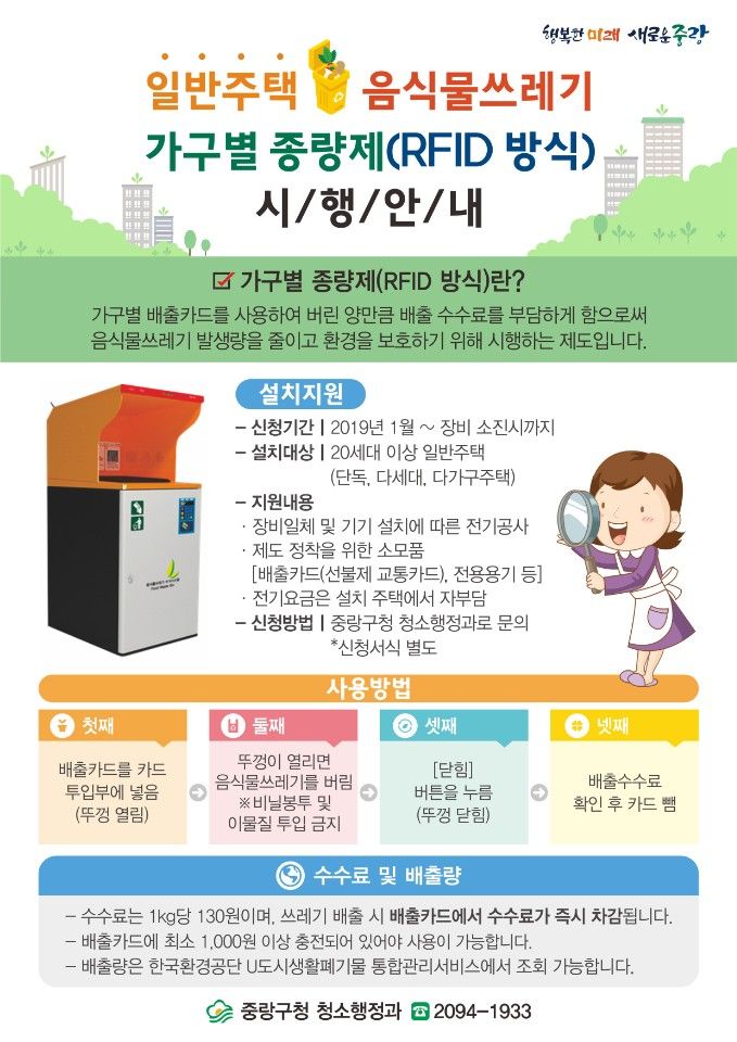 신청 접수 후 주택형태, 세대 수, 전담 관리인 지정 여부 등을 확인 후 대상지를 선정, 대상지에는 기기설치와 유지보수를 지원하고 가구별 배출카드, 음식물쓰레기 전용용기 등 소모품도 지원한다. 자세한 사항은 중랑구청 청소행정과(☎2094-1974) 로 문의하면 된다.