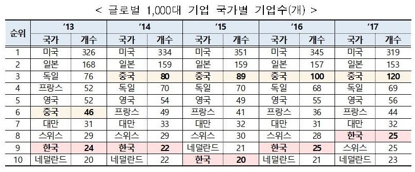 한국산업기술진흥원은 11일 글로벌 1000대 기업의 2017년 R&D투자 현황을 분석한 스코어보드를 발표했다. 이에 따르면 상위 10개 국가의 순위는 대체로 큰 변화가 없으나, 중국 기업들의 상승폭은 최근 몇 년 사이 두드러진다. R&D 투자 상위 글로벌 1000대 기업 중 중국 기업 수는 전년 대비 20개 늘어난 120개였다.