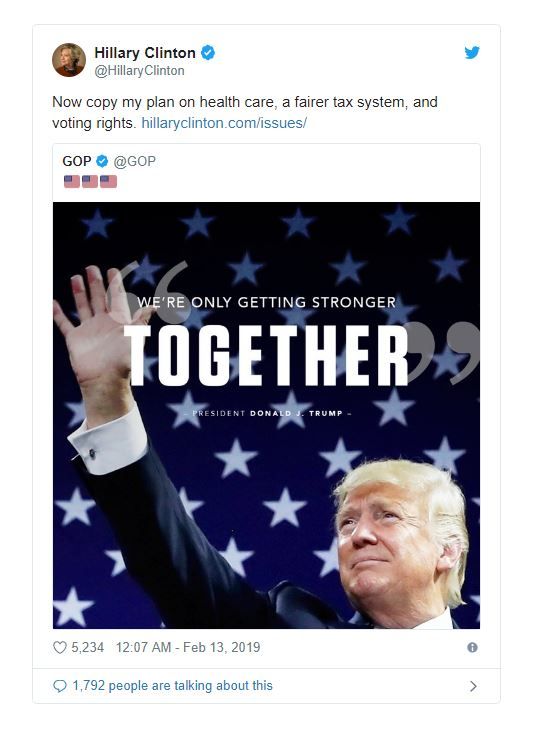 이 소식을 들은 클린턴 전 장관은 트럼프 대통령과 공화당을 맹비난했다. 그는 공화당의 공식 트위터 계정에 올라와 있는 이 슬로건이 들어간 포스터를 자신의 트윗에 캡처해 올리며 "나의 의료보험 정책, 공정한 세금체계, 투표권도 따라하라"고 비꼬았다.