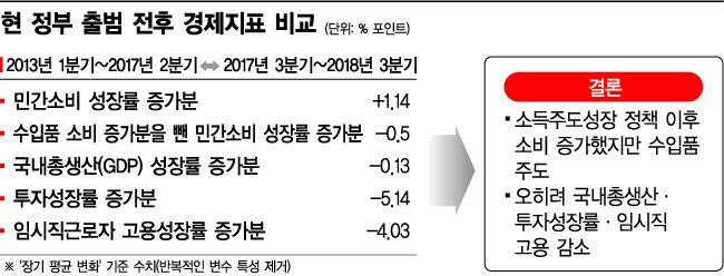 현 정부 전후 대비 소비 늘었지만 수입품 위주…투자, 고용, 생산성은 감소