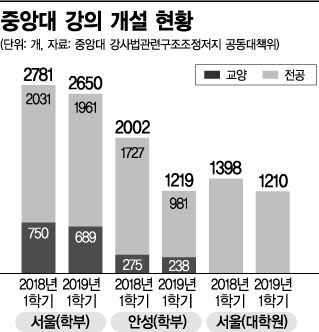 중앙대 역시 서울캠퍼스의 교양 과목 수가 지난해 750개에서 올해는 689로 61개(-8.1%) 줄었다. 안성캠퍼스의 경우 전공과목이 746개(-43.2%)나 사라졌다. 중앙대 강사법관련 구조조정저지 공동대책위는 "교내 수강신청 시스템을 통해 개설강좌 수가 급감한 것이 확인됐는 데도 대학 본부 측은 구체적인 자료 공개 없이 실제 개설강의는 1% 정도만 줄었다고 주장하고 있다"며 "강사 수 역시 1년 전보다 264명이나 감소했다"고 전했다.