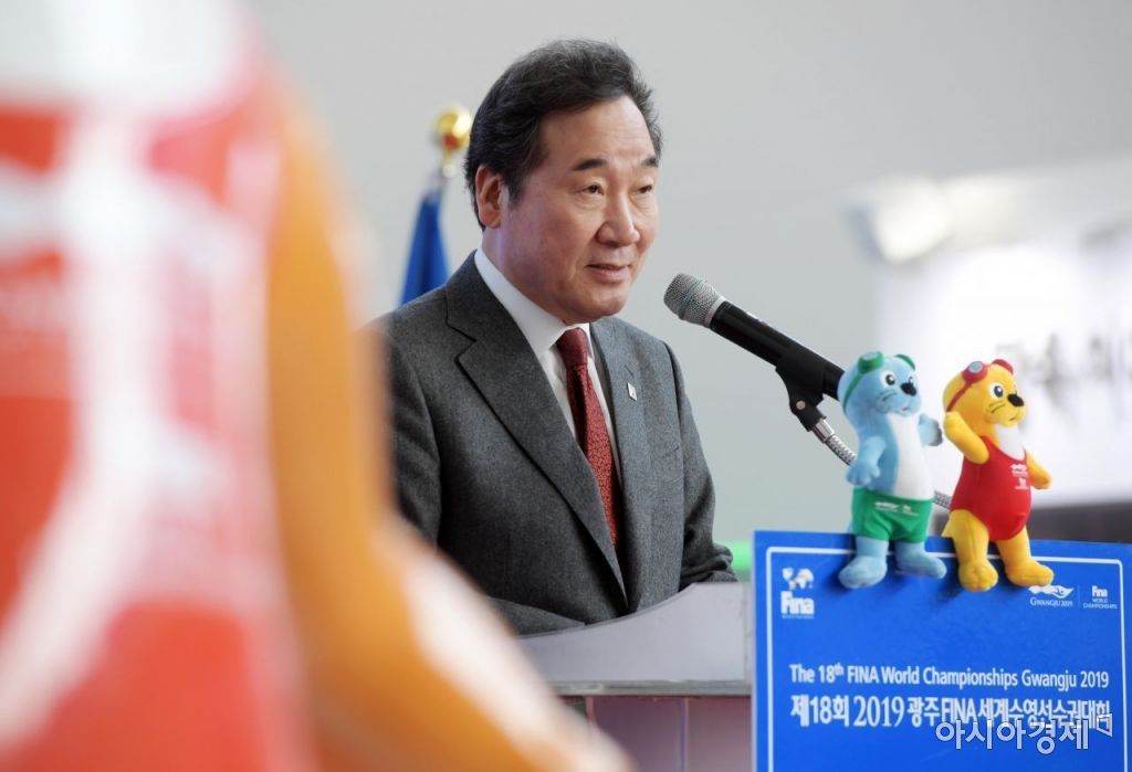 2019 광주세계수영선수권대회가 150일 앞으로 다가온 11일 서울역 대합실에서 열린 마스코트 조형물 제막식에서 이낙연 국무총리가 인사말을 하고 있다. /문호남 기자 munonam@