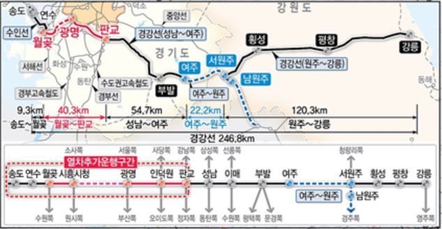현재 인천 송도에서 강릉까지 버스로 3시간 52분이 소요되나 월곶∼판교 복선전철이 개통되면 경강선(판교~강릉)과 연계운행을 통해 소요시간이 2시간 2분이나 줄어들어 1시간 50분 만에 수도권 서남부 지역과 강원권을 잇게 된다.