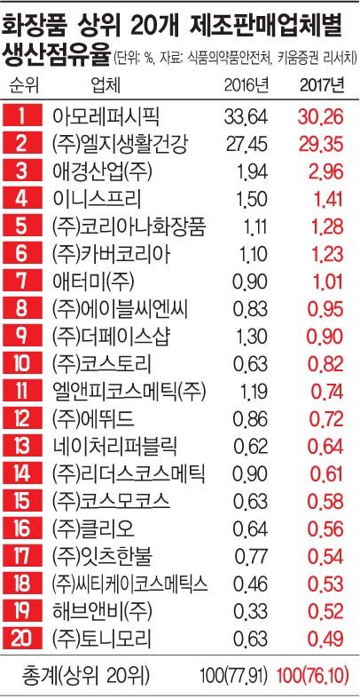 애경산업의 생산실적 점유율이 1.94%에서 2.96%로 확대된 것을 제외하면 모두 0.5~1%를 점유해 국내 화장품 시장은 아모레퍼시픽과 LG생활건강이 이끌고 있는 것과 다름없다. 또 생산금액을 기준으로 상위 20개 품목을 집계한 결과, 아모레퍼시픽과 LG생활건강의 제품이 각각 9개로 총 18개 순위를 차지했다.