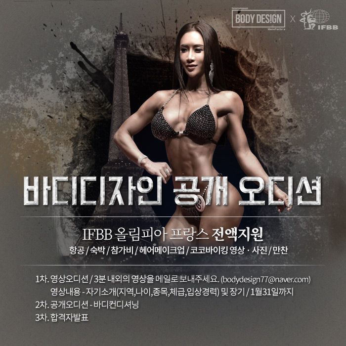 [아시아경제 호남취재본부 문승용 기자] (주)바디디자인&엔터테인먼트 인필이 2월 23일 토요일, 광주 ACC 디자인 호텔 회의실에서 IFBB 프랑스 N.P.C.(National Paralympic Committee) 대회 참가 비용 전액을 지원할 피트니스 선수를 선발하는 공개 오디션을 진행한다.