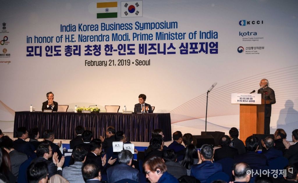 나렌드라 모디 인도 총리가 21일 서울 중구 롯데호텔에서 열린 '한-인도 비즈니스 심포지엄'에 참석해 인사말 하고 있다./강진형 기자aymsdream@