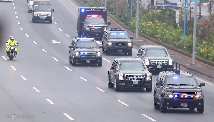23일(현지시간) 오전 9시께 미국 대통령 전용 리무진 '캐딜락 원'과 경호차량 '쉐보레 서버밴 등이 하노이 시내를 내달리고 있다. 이 차량들은 미군 대형 전략 수송기를 타고 하노이 노이바이 국제공항에 도착했다. [사진=VnExpress]