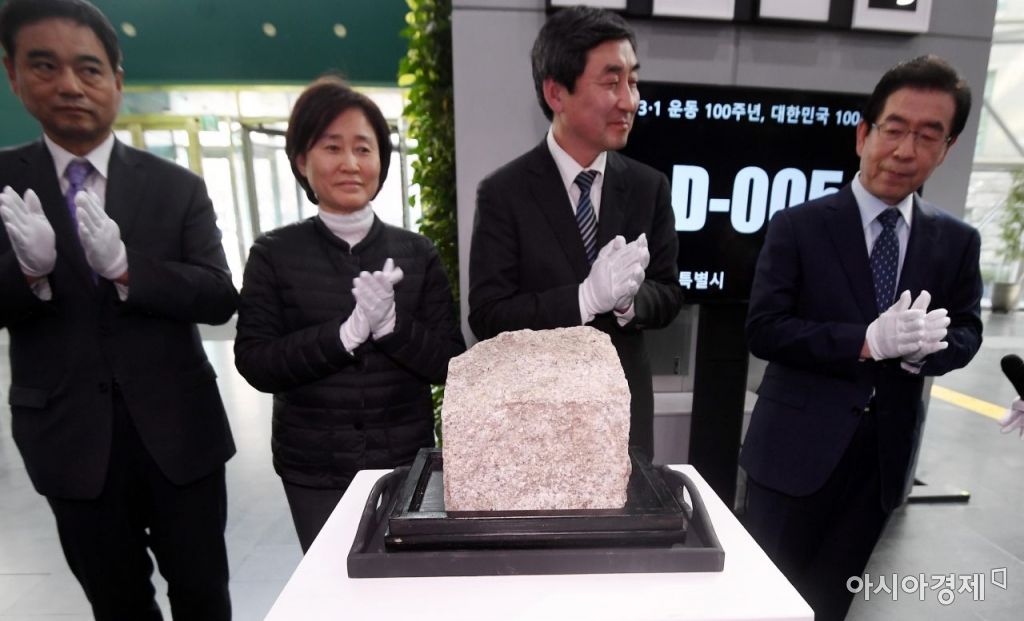 강맹훈 서울시 도시재생실장(왼쪽부터), 윤봉길 의사의 장손인 윤주경 선생, 독립운동가 이은숙 선생의 손자인 이종걸 더불어민주당 의원, 박원순 서울시장이 24일 서울시청 로비에서 `3.1운동 100주년 서울시 기념사업'의 하나로 열린 `서울 돌' 인수식에서 박수치고 있다. 창신동 채석장에서 채굴돼 조선총독부 건물에 쓰였던 '서울 돌'은 인사동 태화관터에 조성될 '3.1독립선언 광장'의 주춧돌로 쓰이게 될 예정이다. /김현민 기자 kimhyun81@