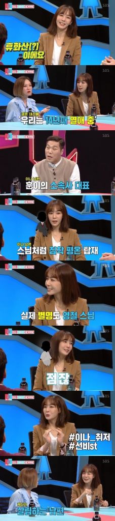 이날 MC 서장훈은 “김이나 남편분을 잘 안다. 제 소속사 대표다. 김이나의 평온한 결혼생활에 남편의 성격이 한몫할 거다. 스님처럼 침착하고 평온하다”며 김이나의 남편인 미스틱엔터테인먼트 조영철 대표 이사를 언급했다.