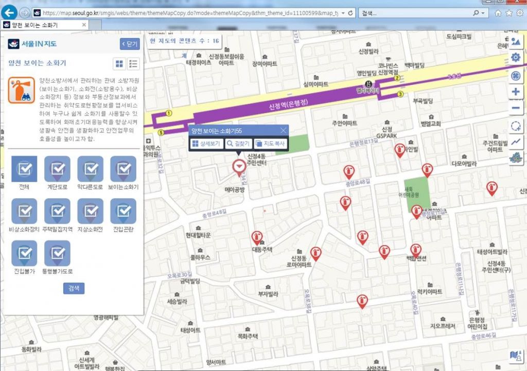 이에 양천구는 구민과 소방안전관계자 등이 이용할 수 있는 ‘소방안전지원 모바일 서비스’를 시행한다. 우선 양천소방서와 협업하여 소방자원(보이는 소화기, 비상소화장치, 소화전)정보를 지도기반 공간정보 시스템에 구축했다.