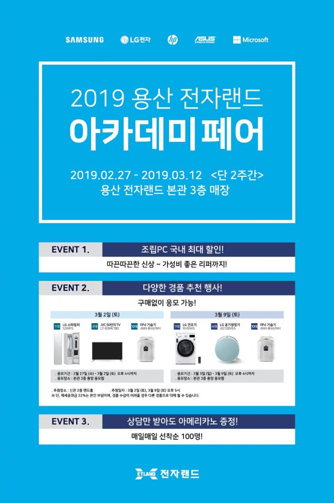 [아시아경제 이지은 기자] 용산 전자랜드를 운영하고 있는 SYS홀딩스는 졸업입학 시즌을 맞아 이달 27일부터 내달 12일까지 '2019 아카데미 페어'를 열고 노트북과 PC 등을 할인 판매한다고 26일 밝혔다.