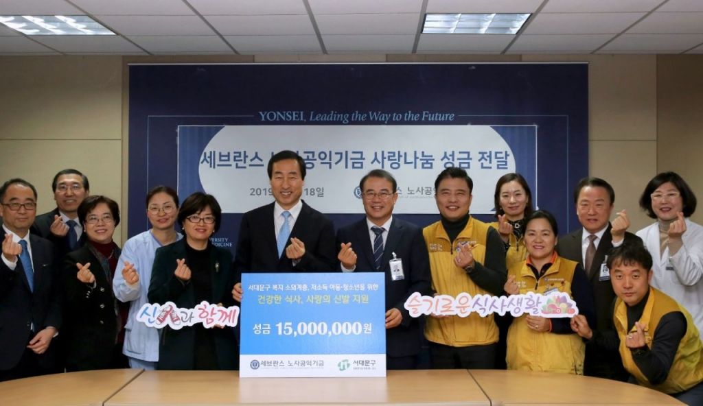 문석진 서대문구청장은 최근 신촌 세브란스병원 회의실에서 열린 성금 전달식에서 “세브란스 노사공익기금에 담긴 사랑과 나눔의 마음이 이웃들에게 잘 전해질 것”이라며 감사의 뜻을 표했다. 서대문구 복지정책과(330-8634)