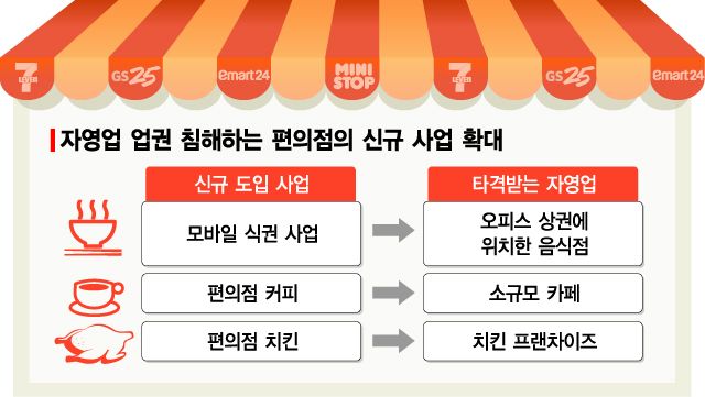 이철 한국외식업중앙회 기획홍보국장은 "그렇잖아도 자영업자들이 어려운 상황에서 편의점들이 사업 영역을 확대하며 자영업 업권을 침해하고 있어 고민이 깊다"며 "편의점 본사는 대기업이지만, 가맹점주들은 소상공인이라 딱히 하소연할 명분도 없는 상황"이라고 답답해했다.