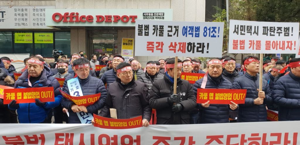 택시업계 관계자들이 11일 서울 여의도 더불어민주당 당사 앞에서 '카풀 저지 집회'를 갖고 있다./윤동주 기자 doso7@