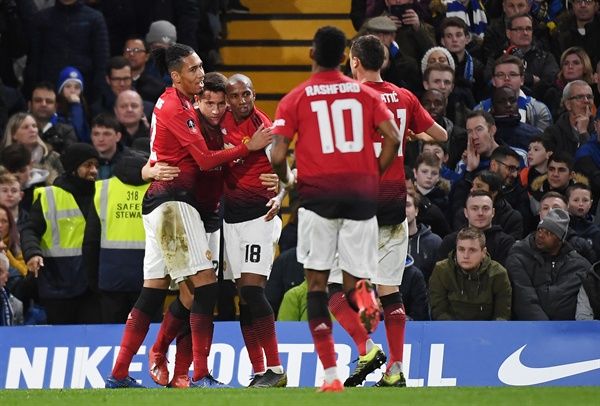 지난달 19일 첼시와의 FA컵 16강에서 에레라의 골을 축하하는 맨유 선수들/사진=EPA연합뉴스