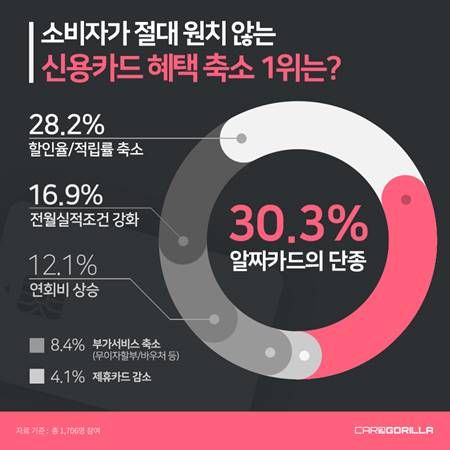 11일 국내 최대 신용카드 전문사이트 카드고릴라가 발표한 ‘소비자가 절대 원치 않는 신용카드 혜택 축소’ 설문조사 결과에 따르면 국내 신용카드 이용자 총 1706명 중 30.3%(516표)가 알짜카드의 단종을 가장 아쉬워하는 것으로 나타났다.