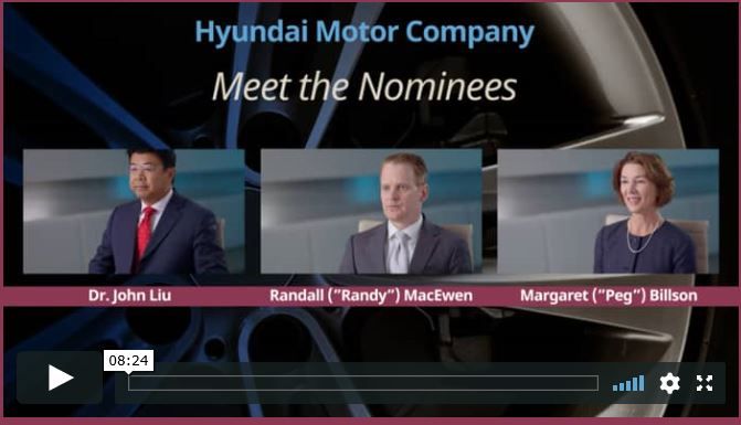 홍보영상은 현대차 8분, 현대모비스 5분 분량으로 이뤄져 있다. 사외이사 후보들은 영상에 직접 출연해 각자의 이력을 소개하고 향후 어떤 역할을 수행할 수 있는지 설명했다. 마가렛 빌슨 이사는 "35년 간 항공산업의 여러 분야에서 종사해 온 경험이 있다"며 "경영진이 목표를 달성하려면 무엇이 필요한지 이사회를 통해 깊게 논의할 수 있도록 할 것"이라고 말했다.