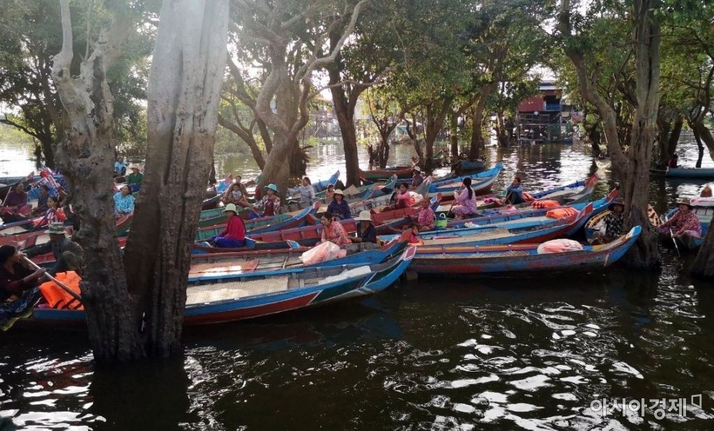 선착장 초입을 빠져나오니 곧 광활한 수평선이 보였다. 친구가 “바다가 좀 특이하지?” 라기에 믿었다. 그도 그럴 것이 톤레삽은 동남아시아에서 가장 큰 호수다. 한참을 가다 보니 바다에 수상 가옥들이 나왔다. 그러다 경찰서에 식당, 심지어 아이들이 옹기종기 모여 앉아 수업하고 있는 초등학교까지. 애매했다. 선장이 재미있는 것을 보여준다며 학교 근처에 배를 세웠다. 곧 학교에서 아이들이 쏟아져 나와 물로 들어가더니 한쪽으로 건물을 밀고 있는 게 아닌가? 물이 빠지면서 균형이 깨지면 애들과 선생님이 나와 하루에 한 차례씩 건물을 밀어 균형을 맞춘다고 했다. 그 모습이 귀여워 넋을 놓고 있는데 잠깐! 싸했다. 바다 한가운데서 아이들이 걷고 있다니! 순간 친구를 쳐다보니 이미 무릎을 꿇고 있었다. 이렇게 바보인증을 하며 곧 목적지에 도착했다. 그 순간 5분 전에 헤드록을 걸던 친구와 끌어안고 뛰었다. 눈 앞에 펼쳐진 광경을 믿을 수가 없어서다. 입이 떡 하니 벌어졌다. 이제껏 좋은 말로 해, 밀크티 같은 물색만 보다 바로 앞에 앤디 워홀의 메릴린 먼로를 형형색색 모아놓은 것 같은 색감을 보고 황홀한 기분까지 들었다. 울창한 숲이 통째로 물에 잠겨 있던 것이다.