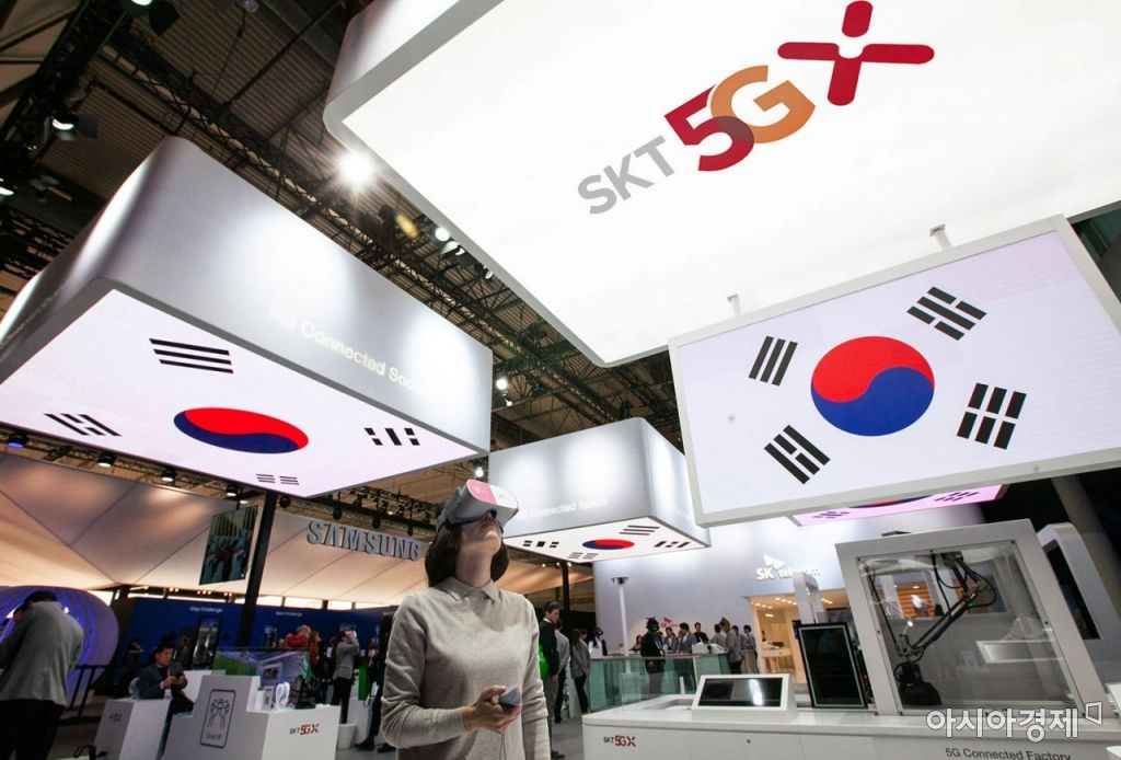 지난달 27일(현지시간) 스페인 바르셀로나 피라그란 비아 전시관에서 열린 'MWC19'에서 SK텔레콤이 3.1절에 맞춰 전시관 대형 디스플레이를 통해 태극기 변천사와 대한민국 100주년 등을 소개했다. /바르셀로나=사진공동취재단