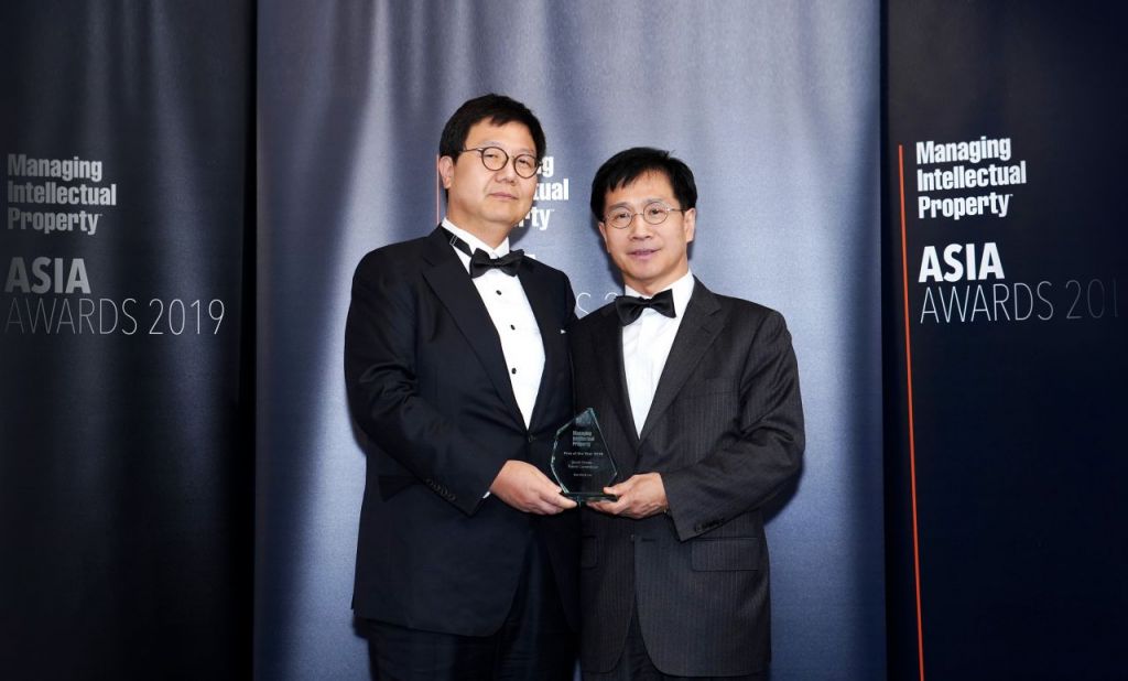 법무법인 태평양이 2019 MIP 아태지역 어워즈에서 한국지역 ‘올해의 특허 분쟁해결 로펌’으로 선정돼 수상하고 있다 좌측부터 강기중, 권택수 변호사 [사진=태평양 제공]